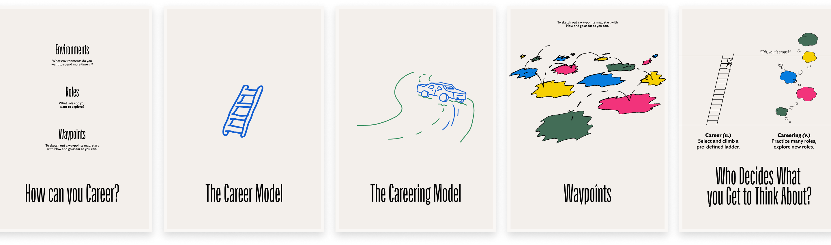 Learners traversing with free will is a style of movement, and that movement has a name: Careering. As a verb, career means to move swiftly and in an uncontrolled way in a specified direction. To career is to switch lanes, swerving into your own route.